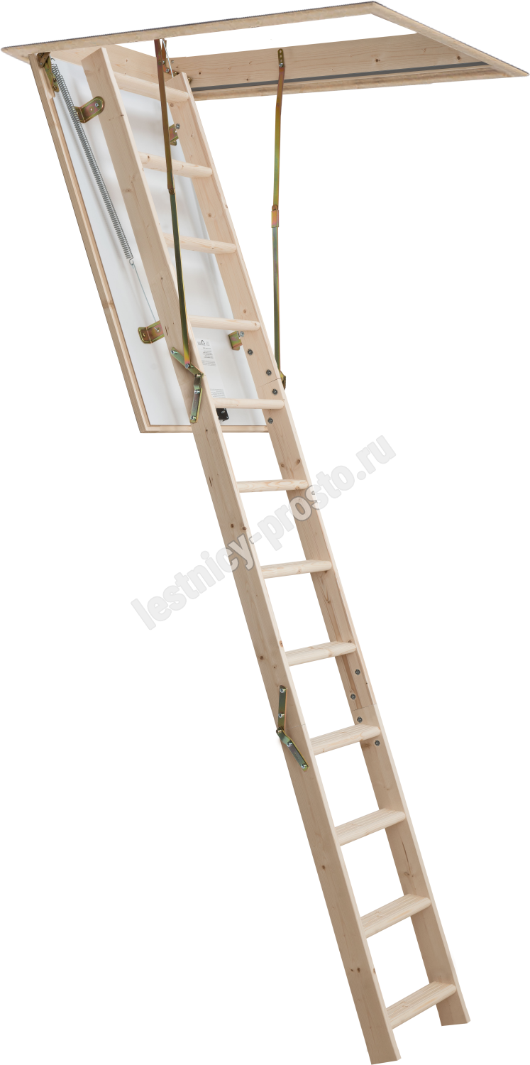 В комплекте: люк из сэндвич-панели, пружинный механизм "короб-люк", короб, трехсекционная лестница с сосновыми ступенями, замок люка, штанга для раскладывания лестницы.