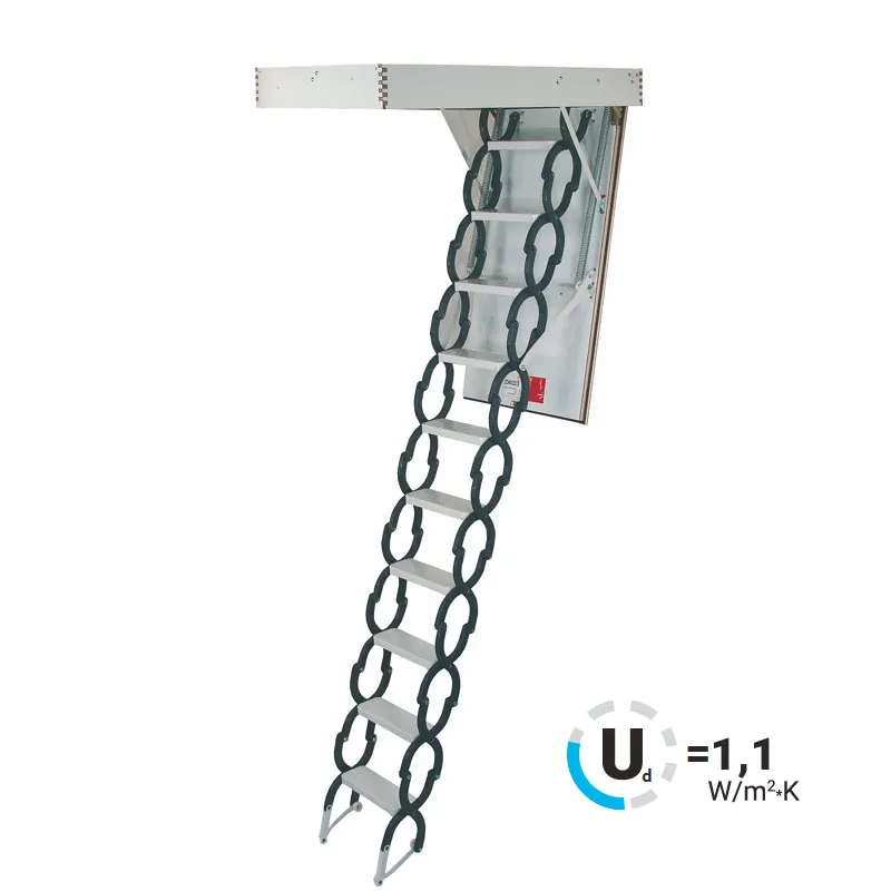 Все элементы лестницы выполнены из экологически чистых материалов и обработаны веществами, не содержащими тяжелых металлов. На ступенях антискользящие насечки. Короб лестницы изготовлен из металла. Термоизоляционная крышка типа "сэндвич" утеплена пенопластом, облицована с двух сторон ДСП белого цвета. Короб люка с уплотнителем. В комплекте деревянный стержень для открывания лестницы.