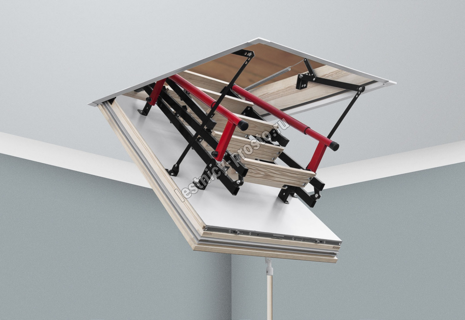 Лестница чердачная, складная, комбинированная 3-х секционная, металлические направляющие/деревянные ступени. Короб люка имеет двухточечную систему запирания. Телескопический поручень имеет внутреннюю пружину и при складывании лестницы служит механическим приводом, что облегчает процесс. Делает его полуавтоматическим. Оборудована дополнительной ступенькой на люке помогающей комфортно подниматься и спускаться. Термоизоляционная крышка типа "сэндвич", толщиной 86мм, утеплена пенопластом, облицована с двух сторон ДВП белого цвета. Лестница подходит для установки в местах с большими перепадами температур. Короб деревянный, высотой 170мм., по периметру проходит уплотнитель. Лестница выпускается для немецкого и английского рынка.