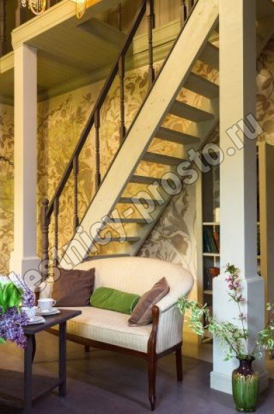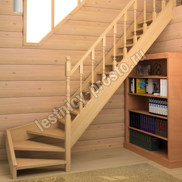 Классическая деревянная лестница с удобным забежным поворотом. Лестница без какого-либо покрытия. В комплекте элементы лестницы и ограждения в разобранном виде, необходимый крепеж, инструкция по сборке.