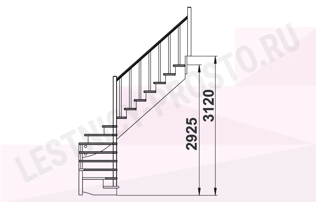Ступени и поручень лестницы изготовлены из сращенного дуба; тетивы, столбы, балясины - из сосны. Возможно изготовление данной модели полностью из дуба. Базовый комплект включает в себя деревянные элементы лестницы и ограждения без какого-либо покрытия.
