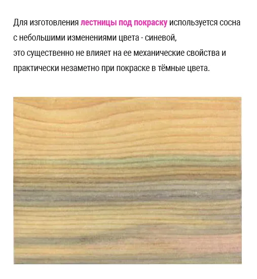 Для изготовления лестницы под покраску используется сосна с небольшими изменениями цвета - синевой, такой допустимый порок древесины существенно не влияет на ее механические свойства и практически незаметен при покраске в тёмные цвета.