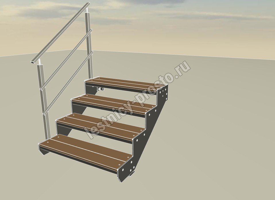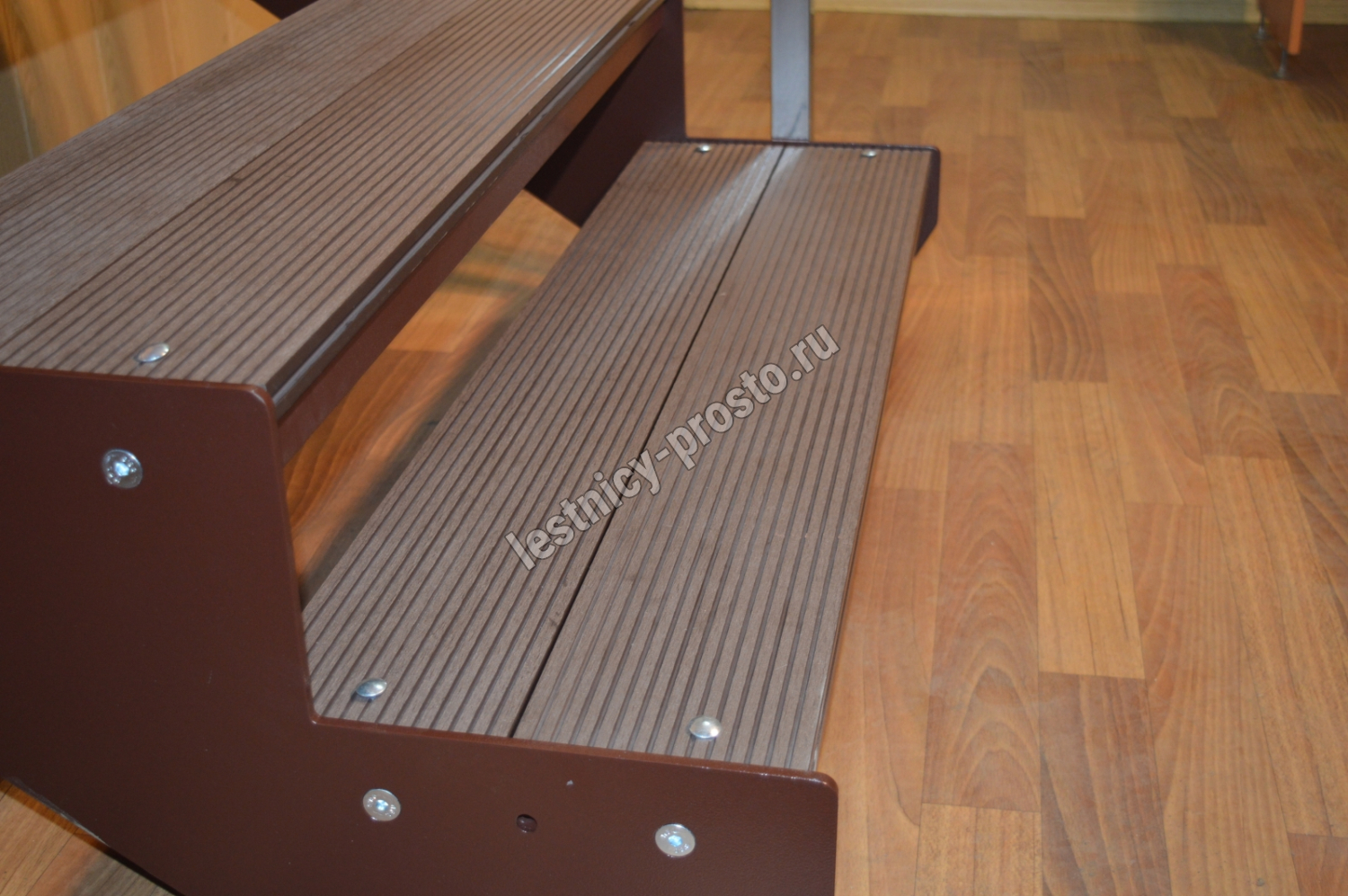 Ступени лестницы состоят из металлической рамки, обеспечивающей необходимую прочность, и покрытия из террасной доски ДПК (древесно-полимерный композит). Ступени не боятся воды и мороза, не теряют со временем свой внешний вид и не требуют ухода.