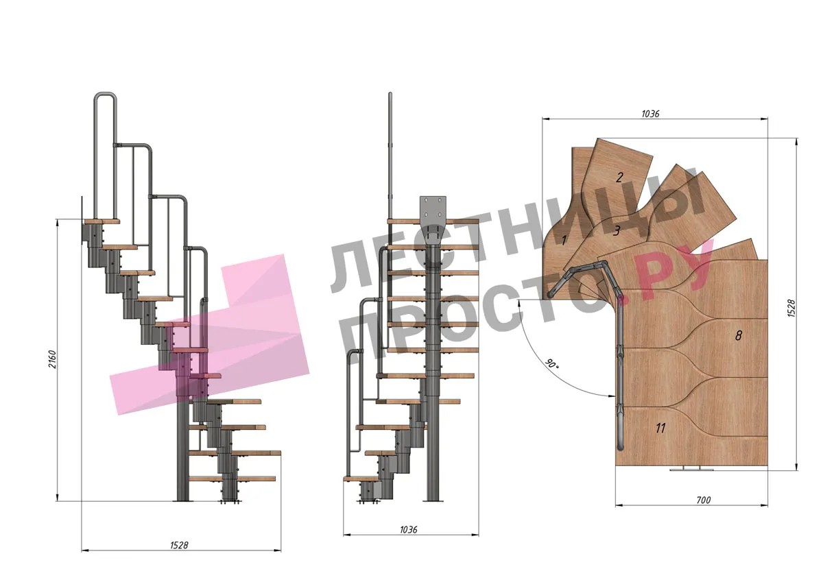 Лестница Prosto Urban Black гусиный шаг 700 мм, h198-288 см (11 ступеней), берёза мультиплекс