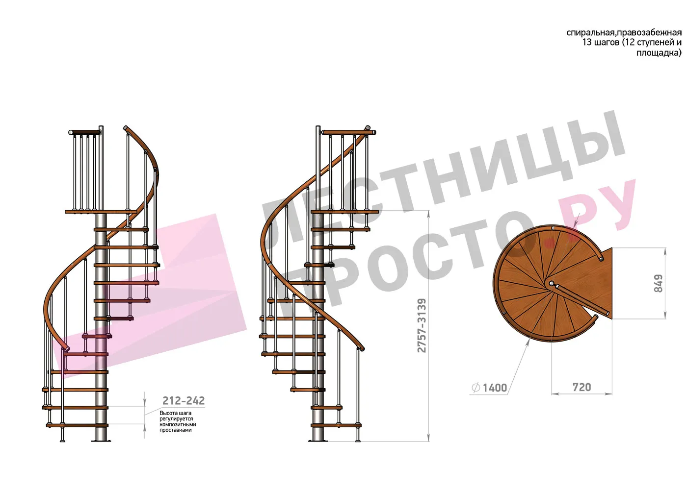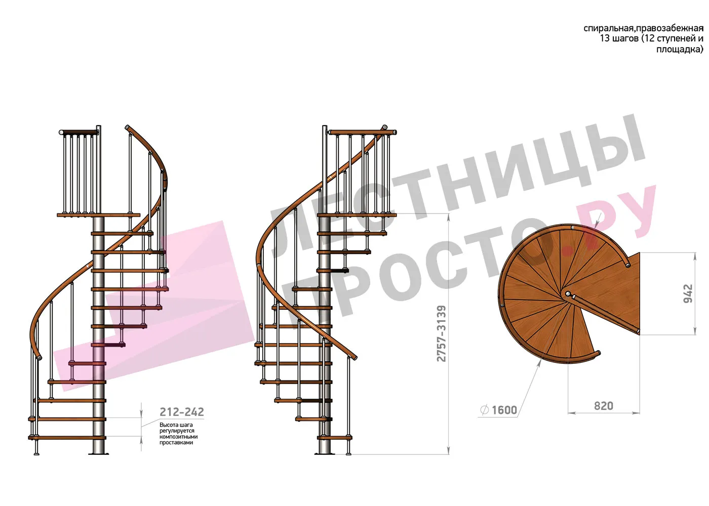 Высота ступеней регулируется с шагом 3 мм. в пределах 212-242 мм., благодаря чему, лестница прекрасно подгоняется под необходимую высоту.