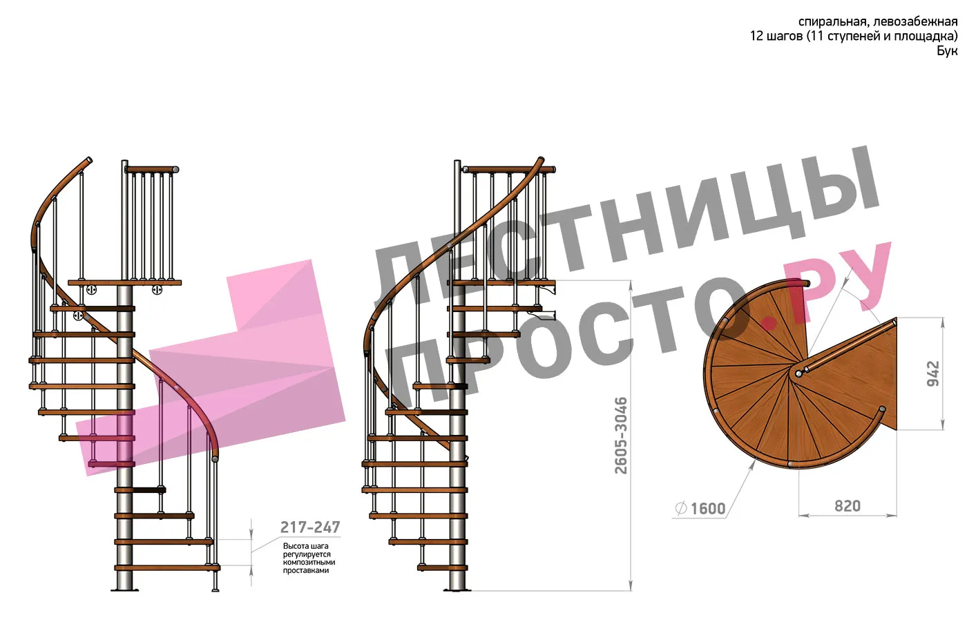 Высота ступеней регулируется с шагом 3 мм. в пределах 217-247 мм., благодаря чему, лестница прекрасно подгоняется под необходимую высоту.